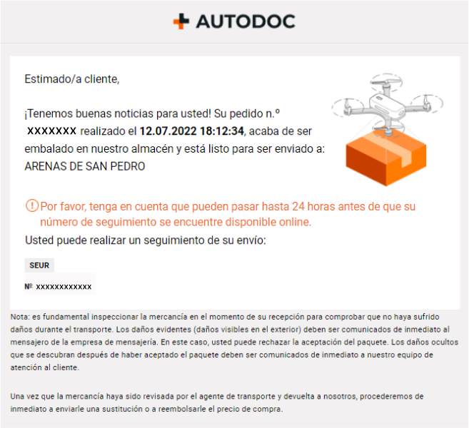 - Una vez que hayamos embalado y enviado su pedido, recibirá un correo electrónico que contiene el número de seguimiento del mismo. Utilícelo para realizar el seguimiento de la ubicación de su paquete.