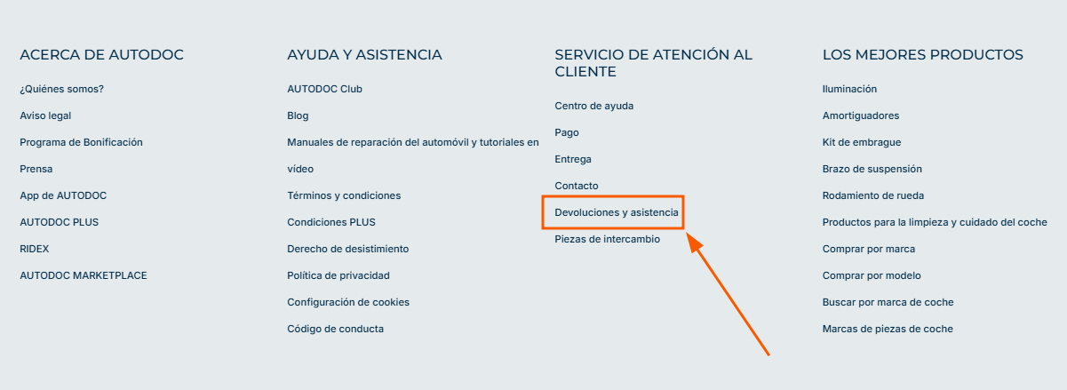- "Mi AUTODOC" → "Mis pedidos" → "Detalles del pedido" → "Devoluciones y asistencia"