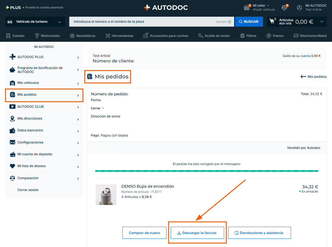 Puedes encontrar y descargar la factura desde "Mi AUTODOC" → "Mis pedidos" → "Detalles del pedido" → "Descargar factura".