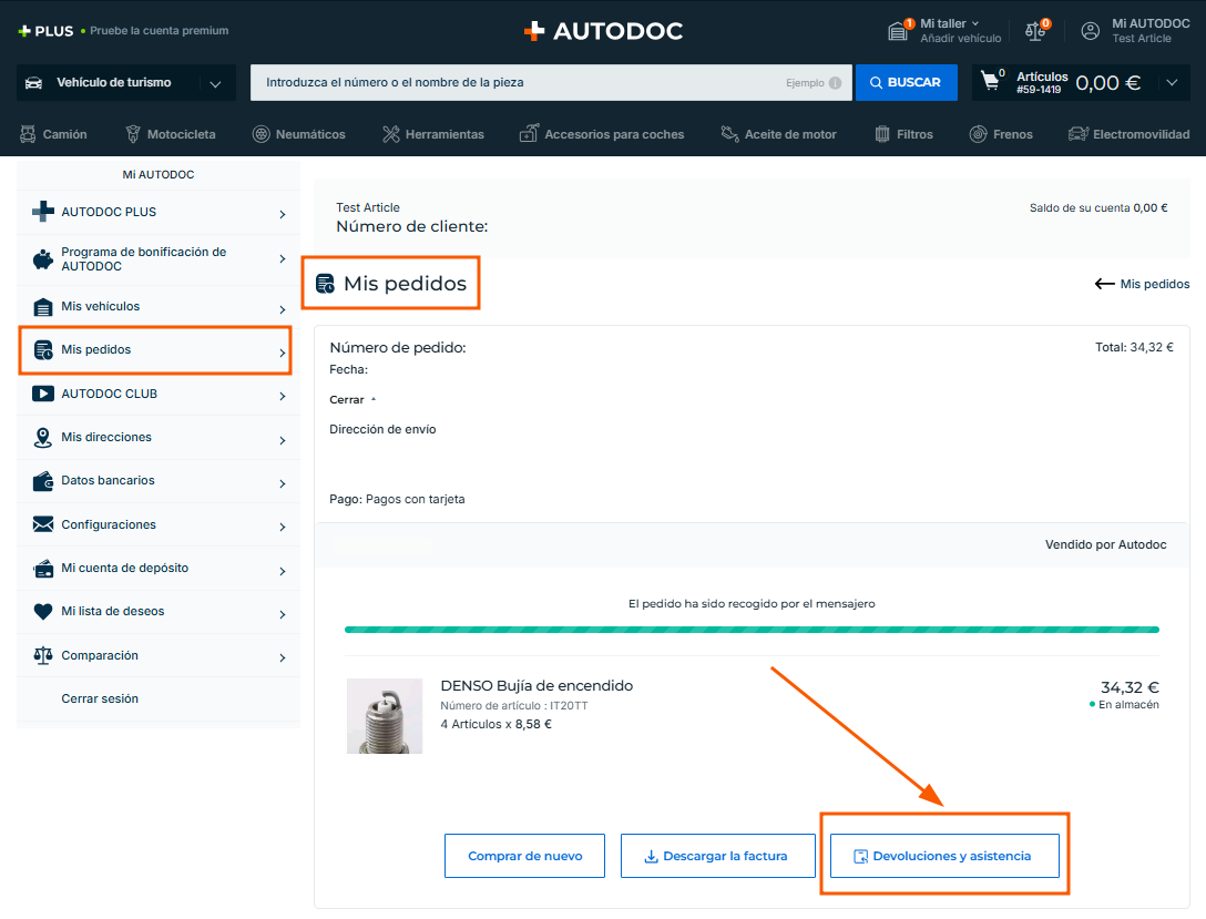 Si la factura no está disponible en "Mi AUTODOC", accede a tu cuenta, localiza el pedido correspondiente y haz clic en el botón "Devoluciones y asistencia" para contactar con el vendedor.
