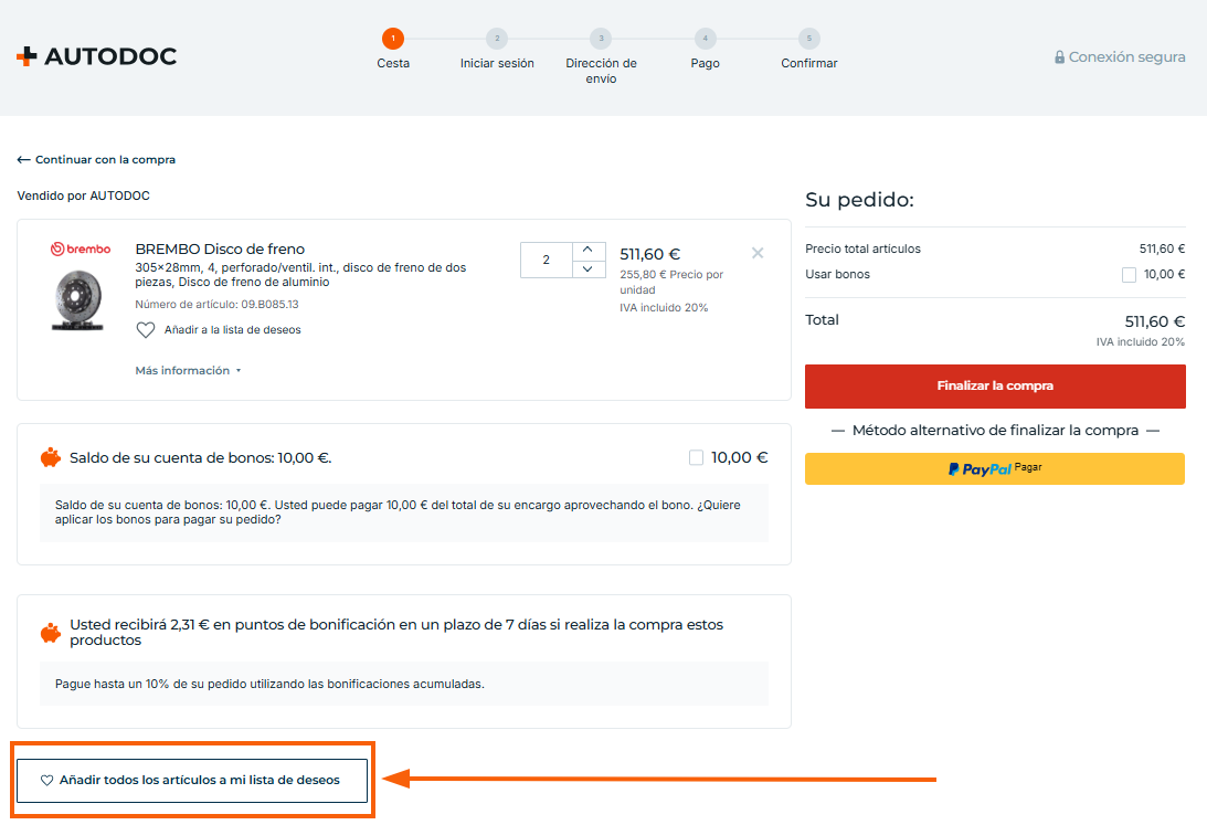 Para añadir todos los artículos de tu cesta a tu lista de deseos, haz clic en Añadir todos los artículos a mi lista de deseos. Un mensaje aparecerá seguidamente informándote de que todos los artículos han sido añadidos a la lista de deseos.
