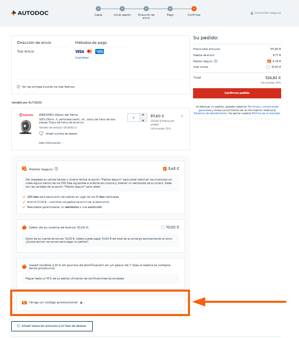 El código del cupón de descuento puede ser introducido en un campo especial, situado debajo de la lista de artículos seleccionados en la cesta de la compra. Tras haber añadido el código de cupón y haber pulsado el botón Utilizar, el sistema recalculará automáticamente el total del pedido, incluyendo el descuento - un mensaje aparecerá para indicar que el cupón ha sido aplicado con éxito.